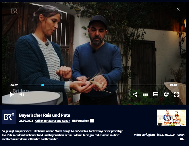Und unser Bayerischer Reis mal ganz anders, und zwar auf dem Grill: Grillen mit Ivana und Adnan: Bayerischer Reis und Pute vom 21.05.2023 im BR, zu sehen in der ARD-Mediathek.