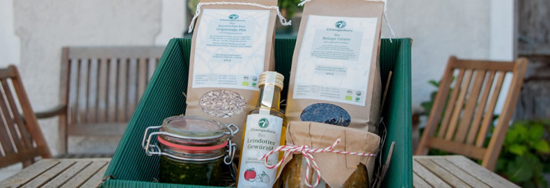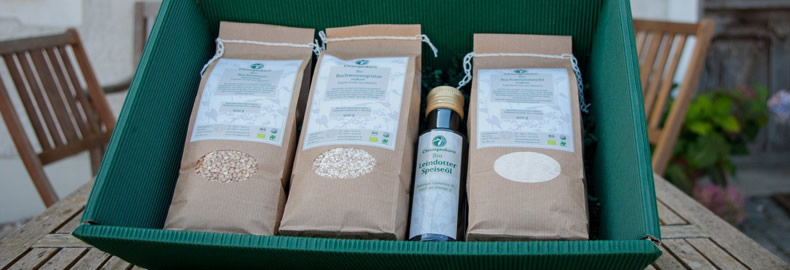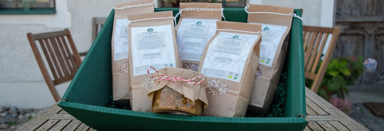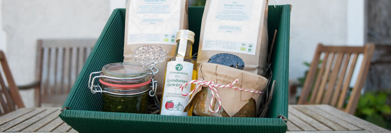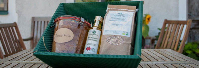 Gesunder Genuss kommt immer gut an! Schenke Deinen Lieben oder auch Dir selbst etwas Besonderes, was es nicht an jeder Ecke gibt: Handgemachte, hochwertige Produkte direkt vom Hof. Unterschiedliche Geschenk-Sets und Einzelprodukte eignen sich für ein individuelles Geschenk, da ist für den Körnerliebhaber, den Öl-Fan und das Schleckermäulchen etwas dabei!