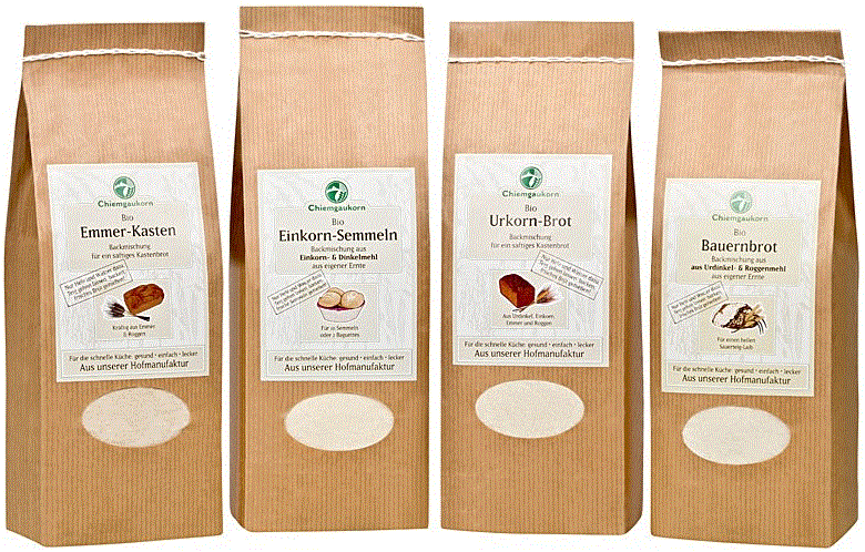 Mehle: zu 100 % aus dem Getreide, das auf der Packung steht (Urdinkel, Emmer, Einkorn, Buchweizen, Braunhirse, Weizen oder Roggen)