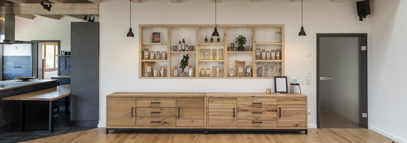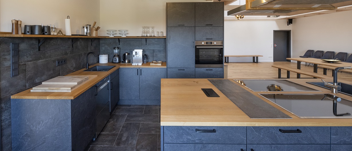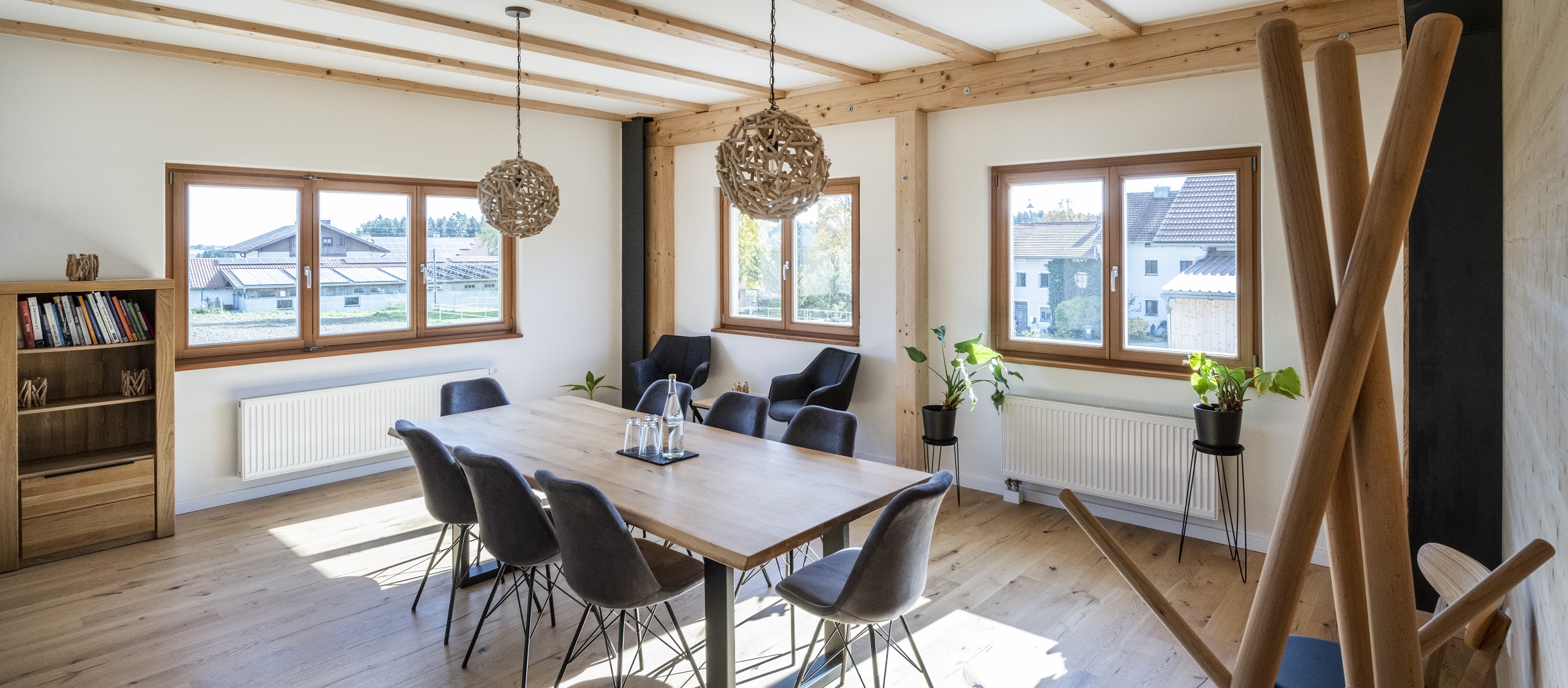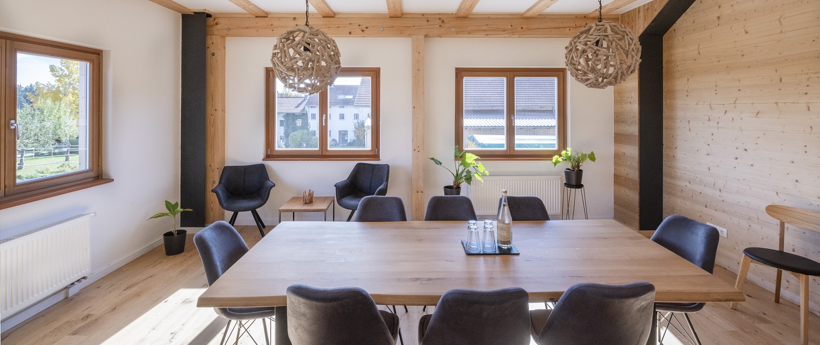 Wir haben einen sehr schönen Seminarraum mit ca. 75 qm mit Vollholzmöbeln, Holzfußboden, Oberlicht und großem Fenster zur Ostseite (Morgensonne!). Hier ist eine großzügige Küche (ca. 20 qm) integriert, die alle gängigen Küchengeräte, Koch- und Essgeschirr sowie einen normalen und einen Gastro-Geschirrspüler bereithält.
