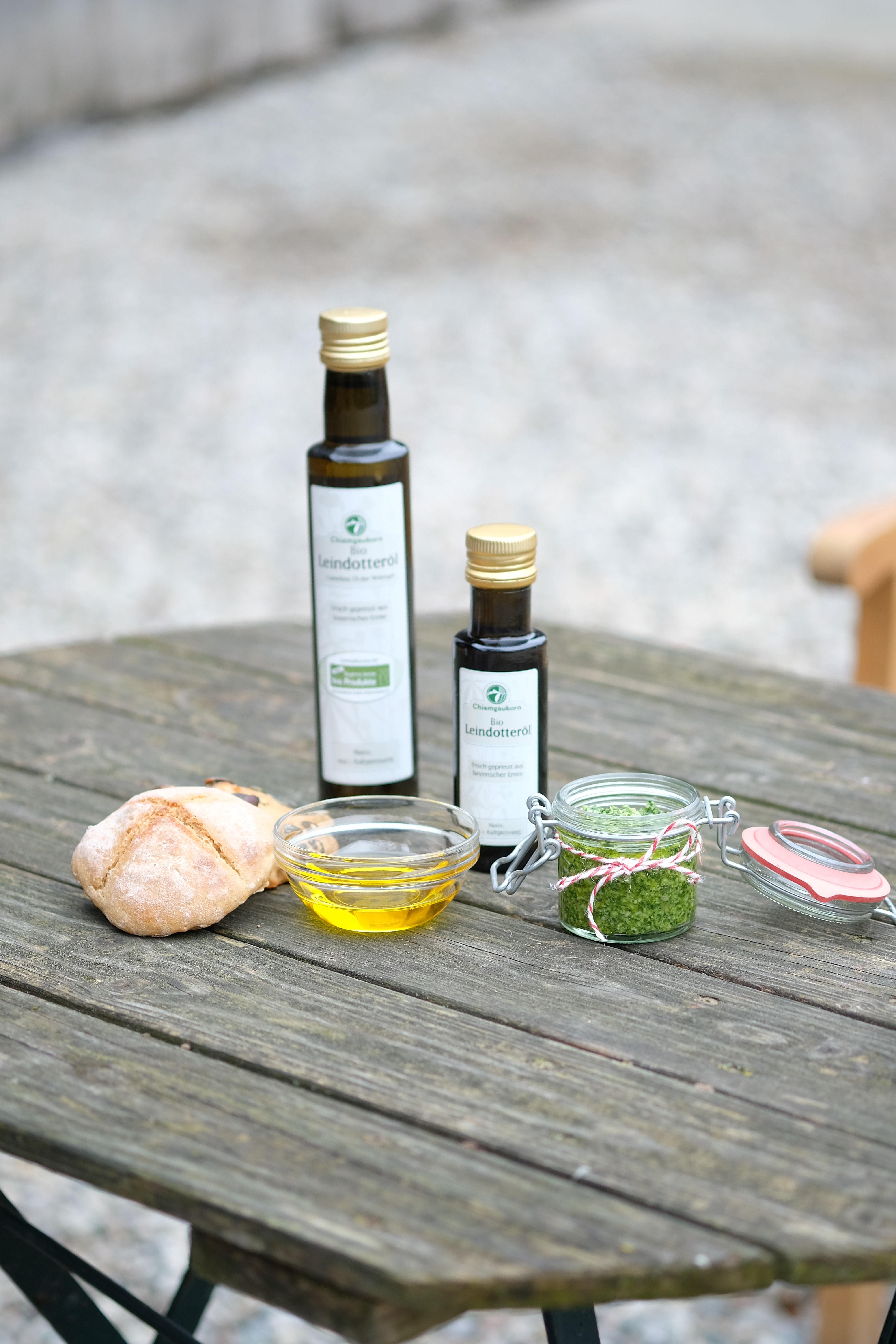 Alle Zutaten mit dem Mixgerät zu sämigem Pesto verarbeiten. Schmeckt zu Pasta oder als Brotaufstrich und kann als Grundlage für Suppen und Soßen verwendet werden.