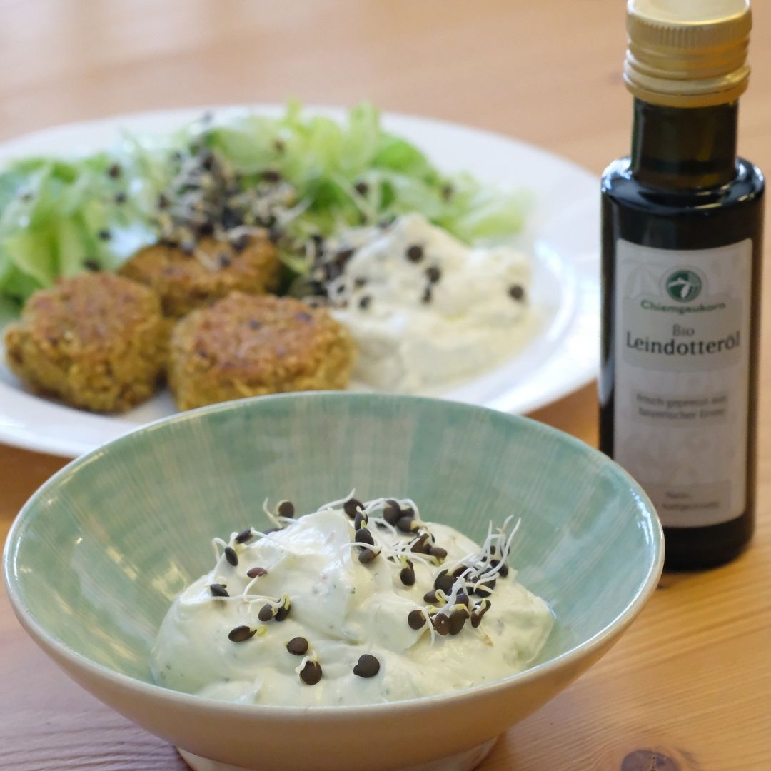 2. Kräuter, Knoblauch, Quark, Joghurt und Öl verrühren, bis ein cremiger Quark entsteht.