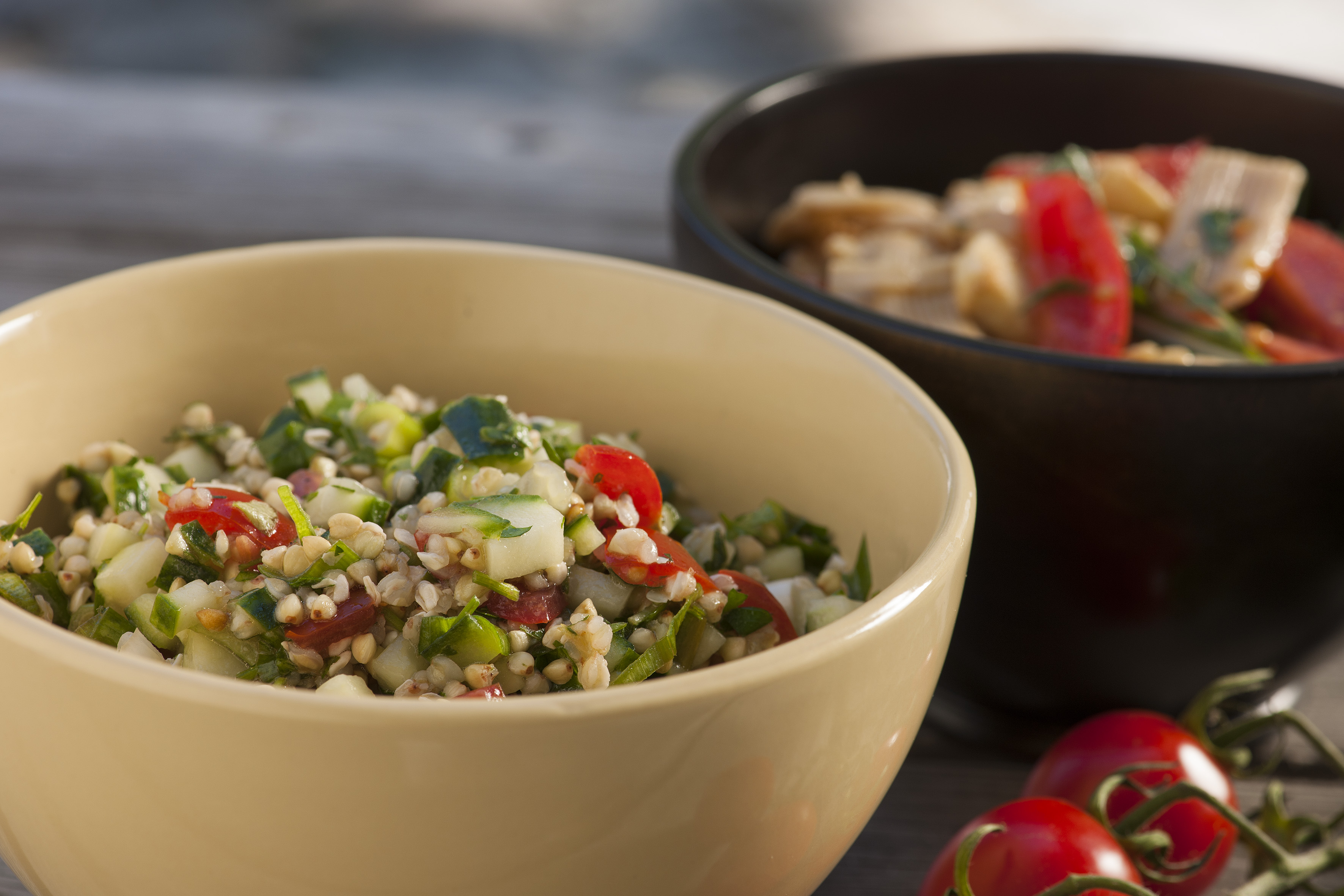 3. Tomaten und Gurke in ca. 0,5 cm große Würfel schneiden. Frühlingszwiebel in feine Scheiben schneiden.