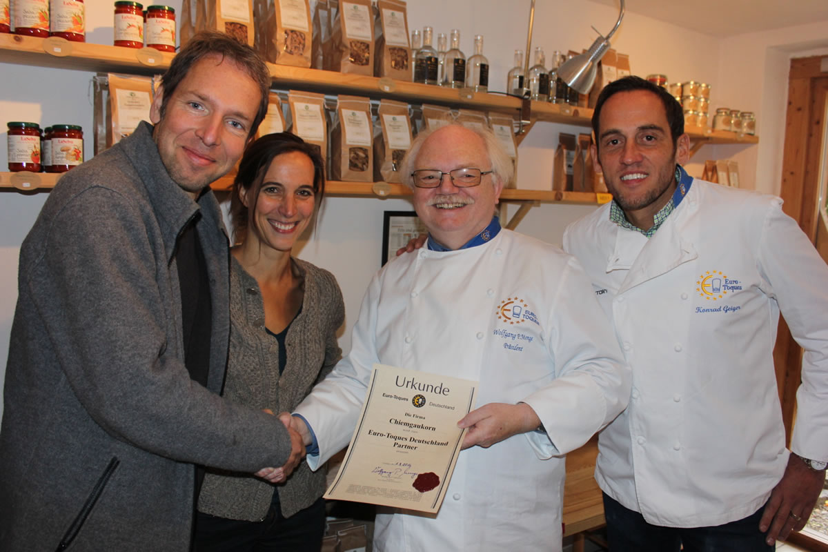 Und so haben Euro-Toques und Chiemgaukorn auch die Mission gemeinsam, die im Ehrenkodex als Artikel 9, 10 und 11 so formuliert ist: „Euro-Toques-Chefs setzen sich für eine Vielzahl von Aromen und Zutaten ein. Sie zeigen dem Verbraucher gesunde Lebensmittel und tragen zu einer ausgewogenen Ernährung bei. Die verwendeten Produkte entsprechen der Jahreszeit, um den Naturzyklus zu achten und den echten Geschmack sicherzustellen. Der Schutz, die Information und die Schulung der Verbraucher sind Teil des Auftrags von Euro-Toques.“