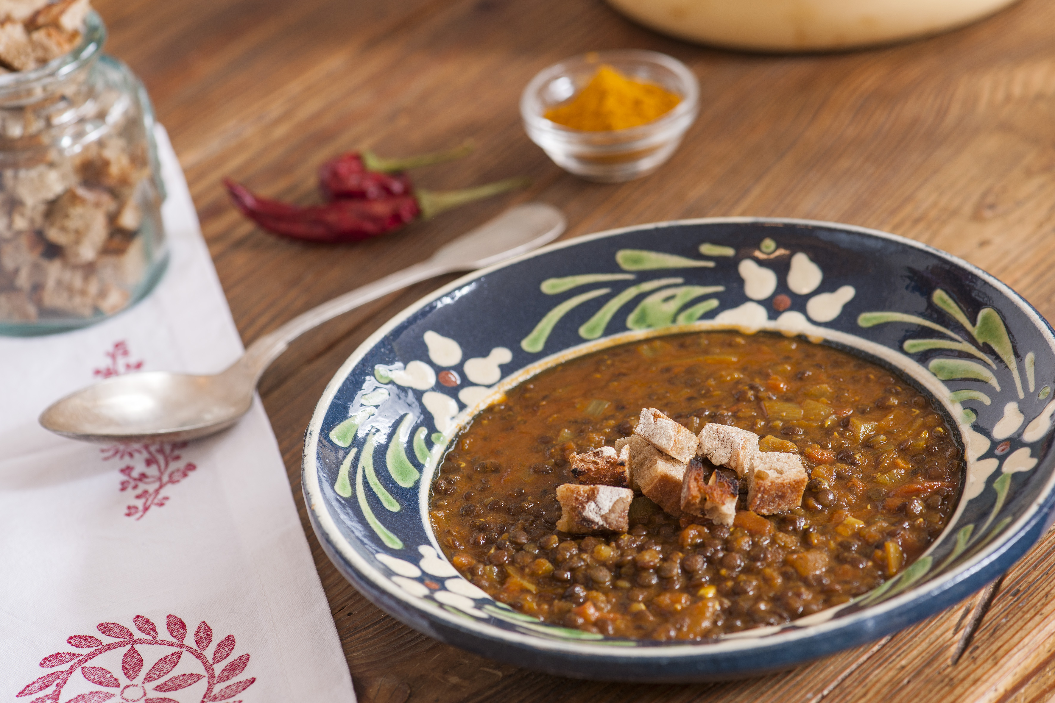 Wenn die Linsen und das Getreide gar gekocht sind, das Gemüse zugeben. Nach Geschmack mit Curry würzen. Mit Pfeffer und Salz abschmecken.
